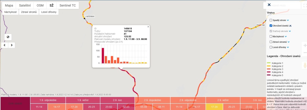 Kliknutím na hektometr se otevře infookno s grafem vývoje ohrožení v následujících 42 hodinách.