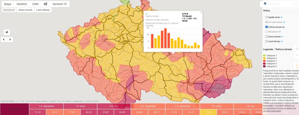 Použitím logistického regresního modelu na výše popsaná reálná data lze získat představu o rozložení a intenzitě hazardu pádu stromů na území ČR. Výsledkem je aktuální stav hazardu a jeho predikce na 45 hodin dopředu, obojí vztaženo k „hektoliniím“ železniční sítě. Aktuální stav i predikce hazardu jsou aktualizovány se stejnou frekvencí jako vstupní data z ALADINa, tedy čtyřikrát denně. S ohledem na dostupnost dat z ALADINa a gridů indexů API30 a SNO2d je tato aktualizace dostupná kolem 7:15 UTC, 10:15 UTC, 15:15 UTC a 22:15 UTC.