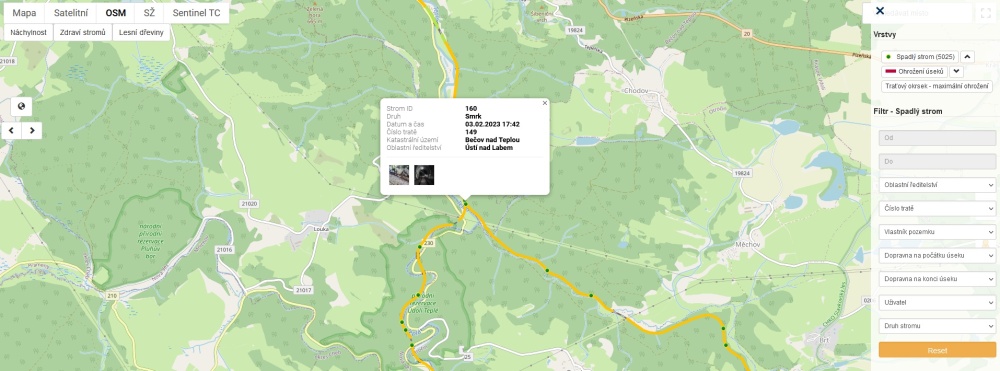 Obr. 3 Spadlý strom s otevřeným infooknem, v pravém panelu je možnost stromy filtrovat
