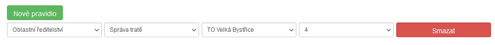 Klinkutím na tlačítko Nové pravidlo se zobrazí nabídka, pomocí které si můžete vybrat zájmové území - oblastní ředitelství, nebo správu tratě nebo traťový okrsek a dále také kategorii (obr. 10).