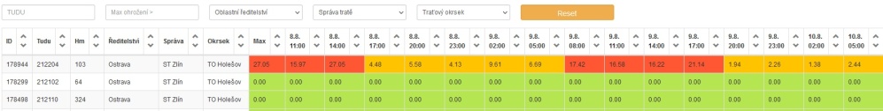 Zobrazuje tabulkový přehled hektometrů a předpověď jejich ohrožení padajícími stromy v následujících 42 hodinách. Ohrožení je vyjádřeno jak hodnotou, tak barvou kategorie, do které spadá.