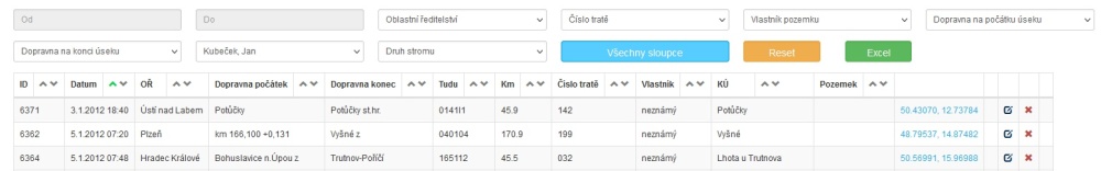 Záznamy lze filtrovat na základě data, ředitelství, čísla tratě, vlastníka, dopravny na počátku a konci úseku, uživatele a druhu stromu (viz obrázek 8).