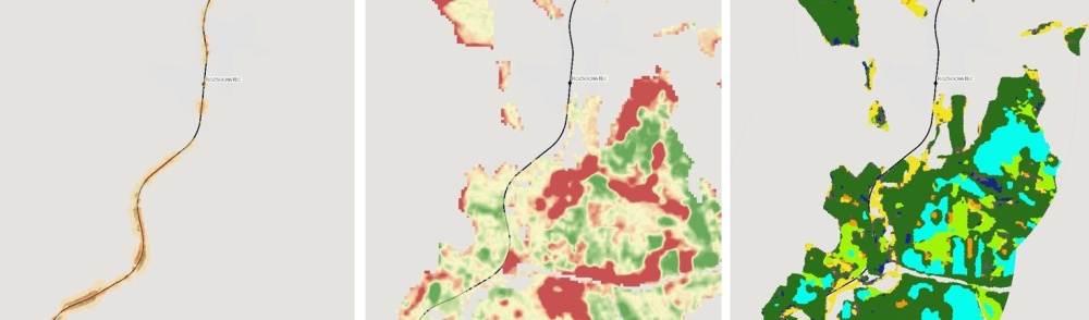 Vrstva je závislá na měřítku a je provázaná s vrstvou traťových okrsků - v menších měřítcích se zobrazují traťové okrsky, ve větších pak ohrožení hektometrů.